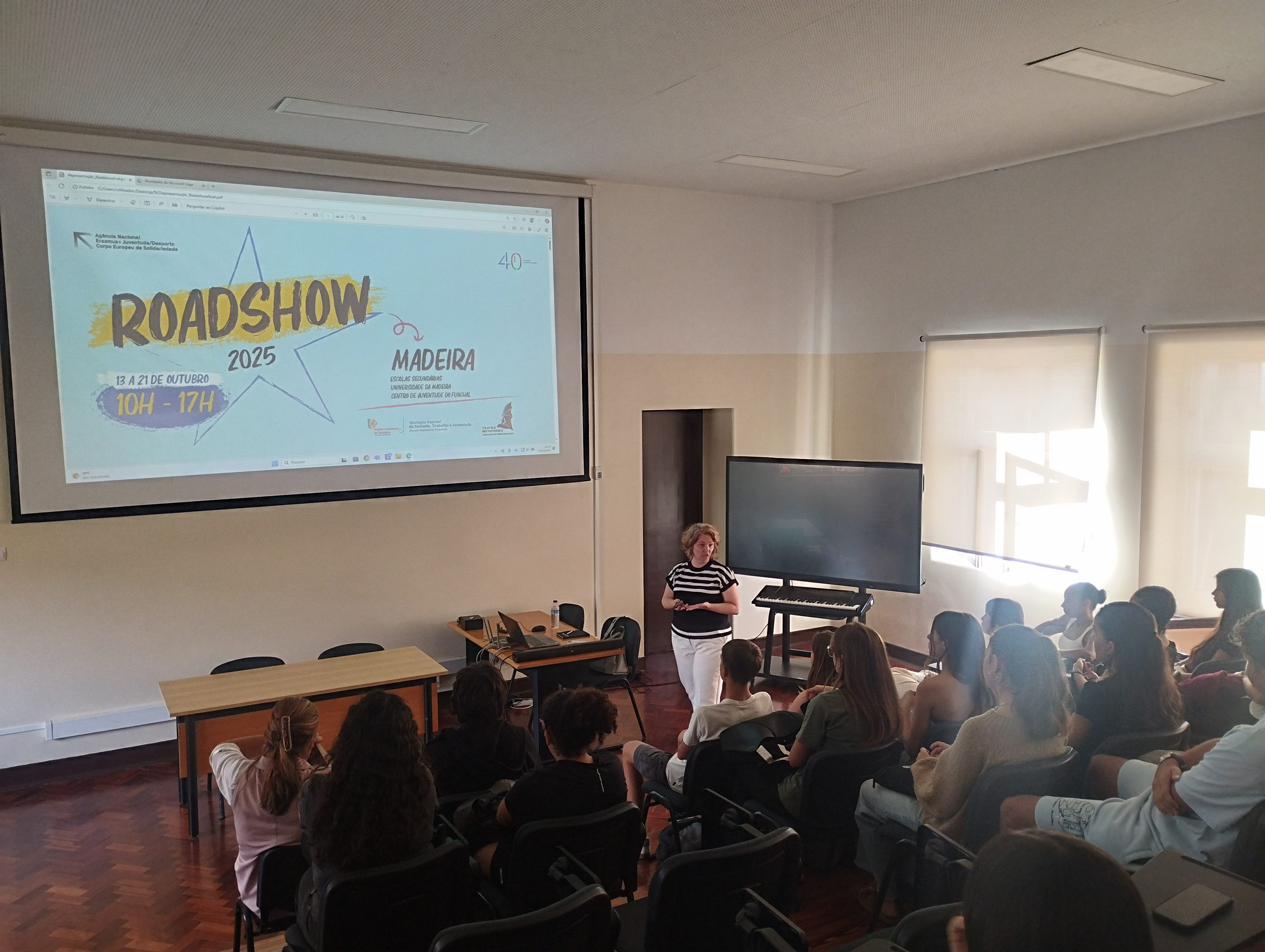 Na manhã do dia 14 de outubro, a Escola Secundária Jaime Moniz assinalou os 40 anos da Adesão de Portugal às Comunidades Europeiascom a participação no “Roadshow 2025 – 40 anos da Adesão de Portugal às Comunidades Europeias”, uma iniciativa promovida pela Direção Regional de Juventude em parceria com a Associação Teatro Metaphora. Esta ação teve como principal objetivo fomentar a partilha de oportunidades oferecidas pela União Europeia, bem como destacar o impacto da UE no quotidiano dos cidadãos, aproximando a Europa de todos, em especial dos mais jovens.